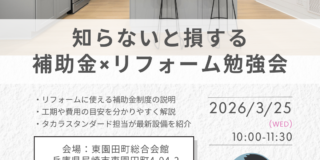 ※こちらのイベントは諸事情により、中止させて頂きます。 リフォームを検討する際に 「費用が分からない」 「補助金が使えるのか不安」 と感じている方に向けた勉強会です。 …