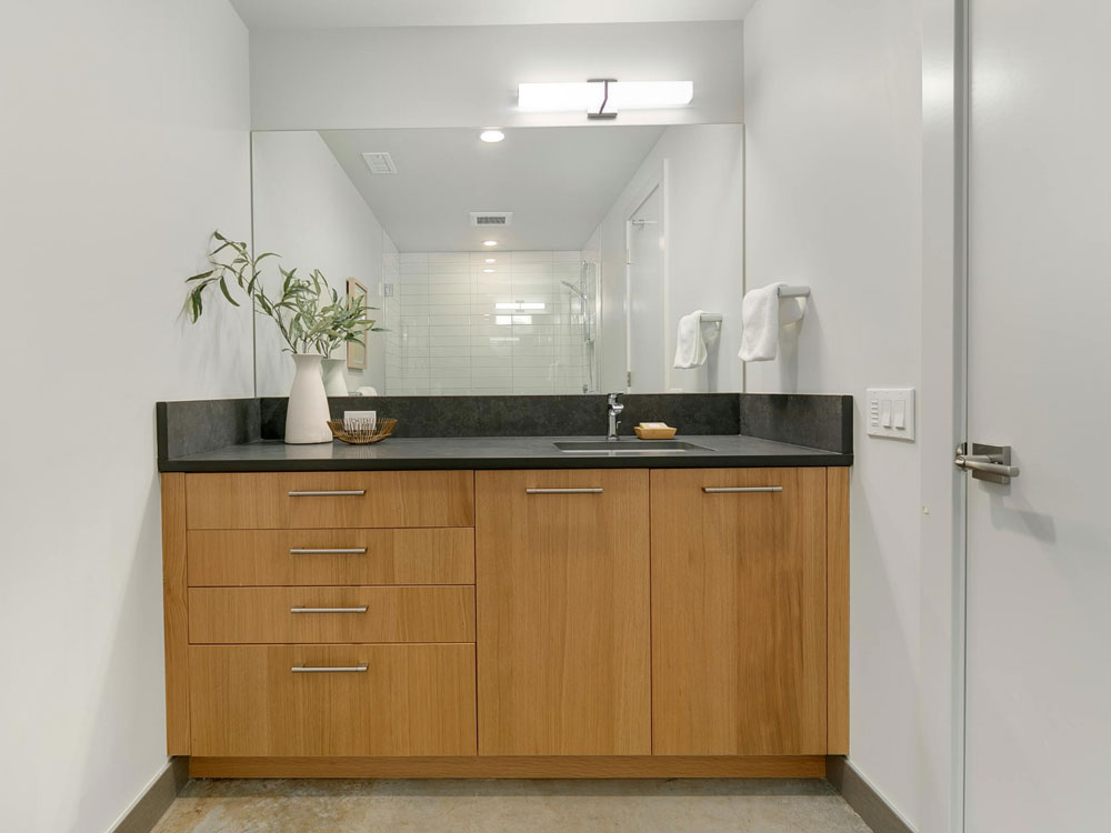 広めの洗面台と収納付きの洗面台で、朝の準備もスムーズに。使い勝手を考えた設計です。