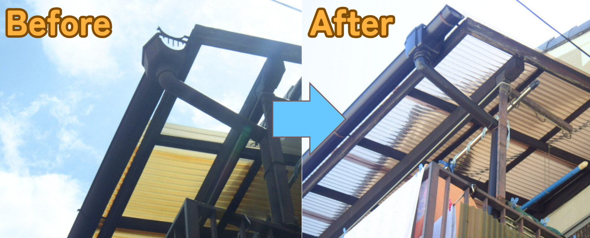 老朽化が進んでいたベランダの屋根は、一部が破損しており、雨の日には洗濯物が干せずお困りの状況でした。